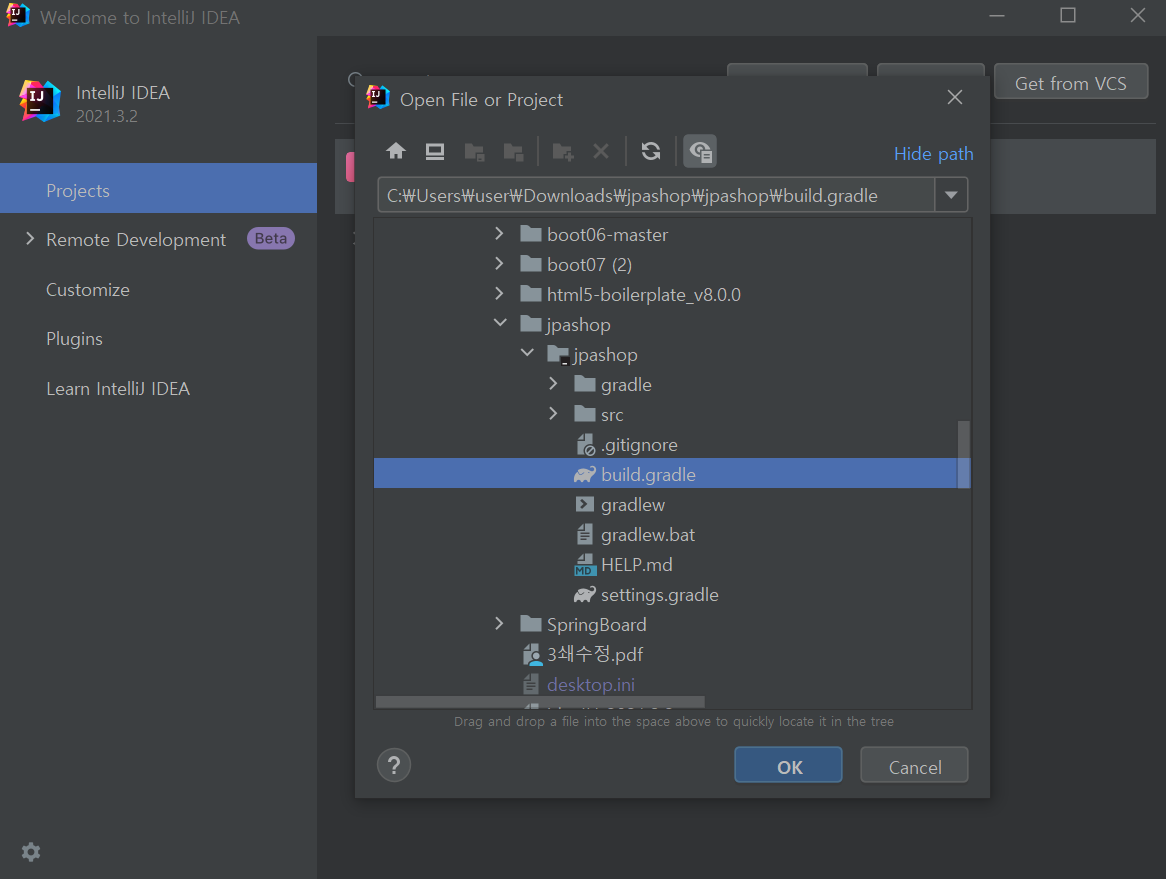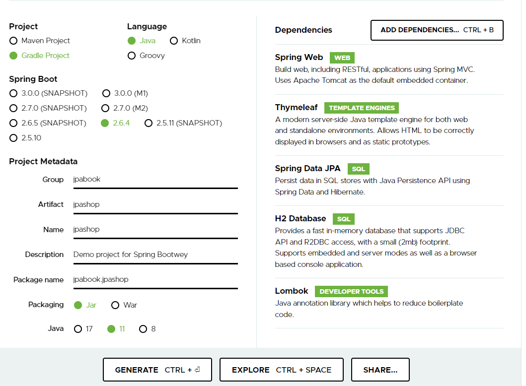 사용 기능 : web, thymeleaf, jpa, h2, lombok, validation groupId: jpabook artifactId: jpashop