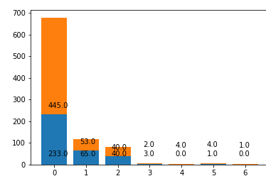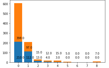 plt.annotate(str(ec_dead_arr[i]),(-0.2+i, ec_alive_arr[i]+30))