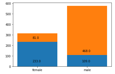9. 성별에 따른 생존자와 사망자를 하나의 막대그래프로 나타내시오.(아래:생존자, 위:사망자)